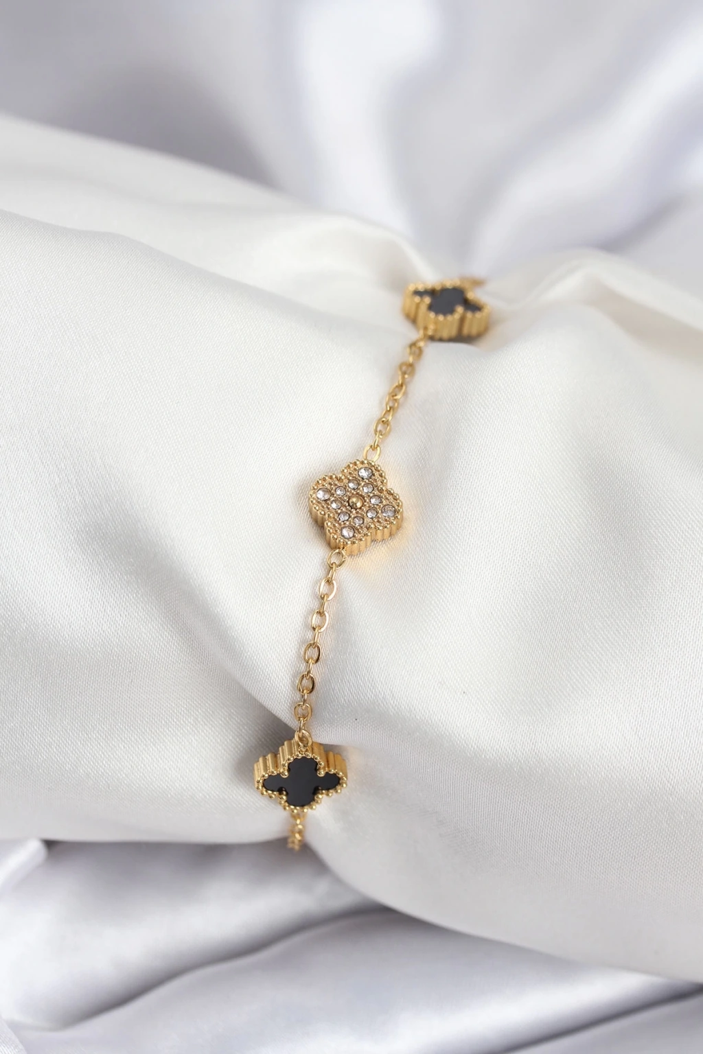 316L Çelik Gold Renk Siyah ve Zirkon Taşlı Baby Boy Yonca Kadın Bileklik