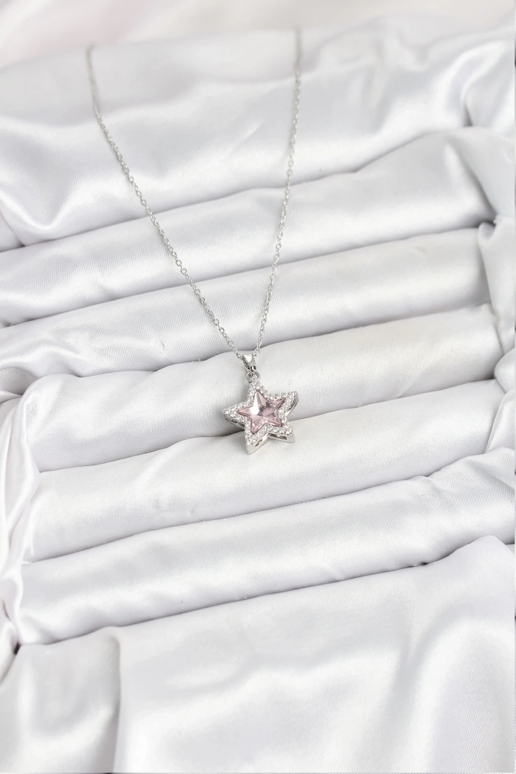 316L Çelik Zincir Gümüş Renk Pembe Taşlı Yıldız Model Kadın Kolye