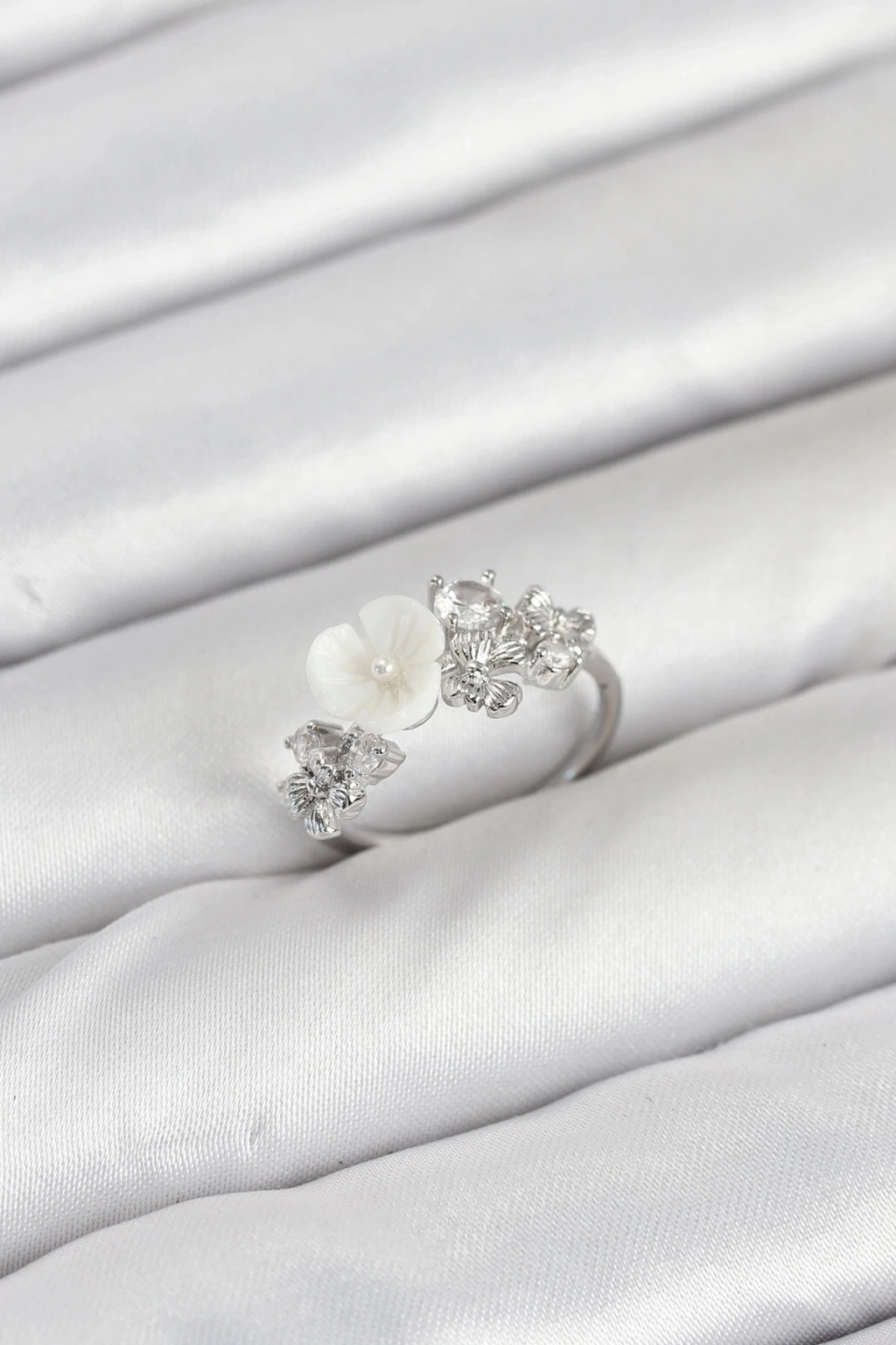 Pirinç Gümüş Renk Çiçek Model Zirkon Taşlı Kadın Yüzük