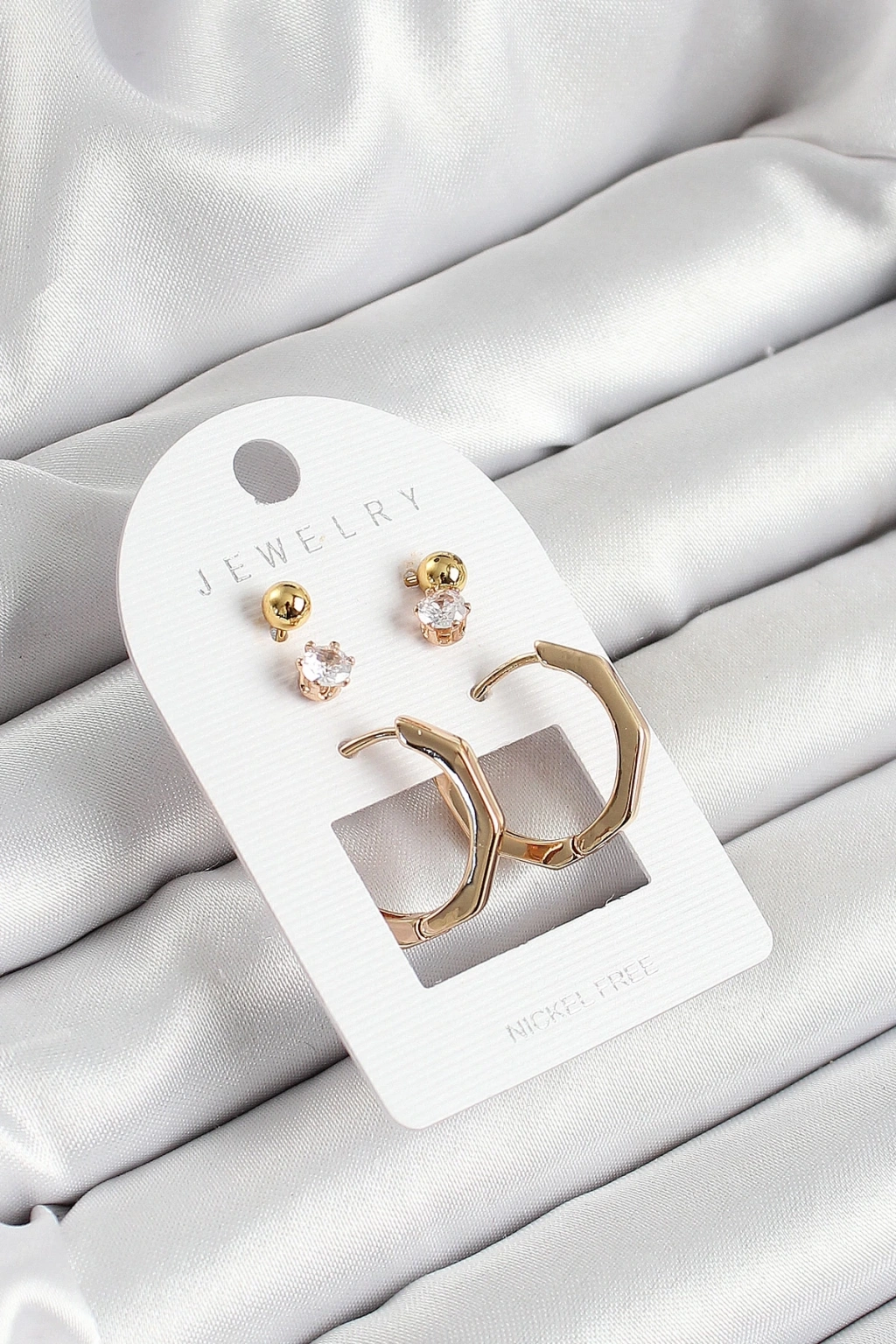 Pirinç Zirkon Taş Ve Kemik Halka Figürlü Gold Renk 3'lü Çift Kadın Küpe Set