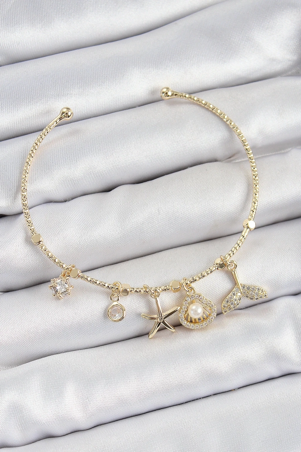 Pirinç Zirkon Taşlı İstiridye Ve Deniz Yıldızı Model Gold Renk Charm Bileklik